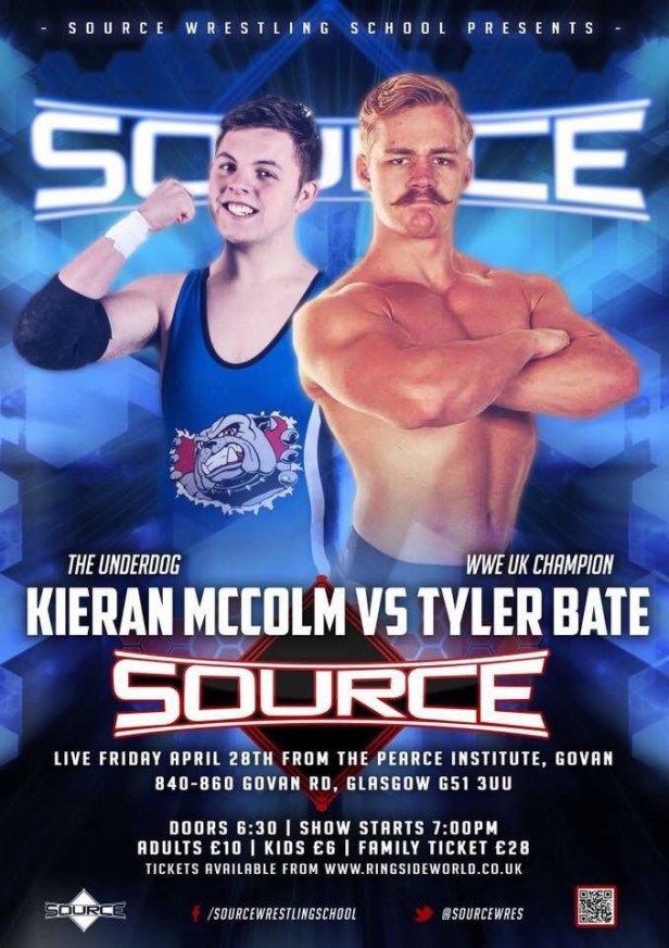 On Friday 28 April, 18 year old “Underdog” Kieran McColm, one of the youngest and brightest talents of the Source Wrestling School, gets the opportunity of a lifetime when he takes on WWE UK Champion, Tyler Bate in the Pierce Institute in Govan.