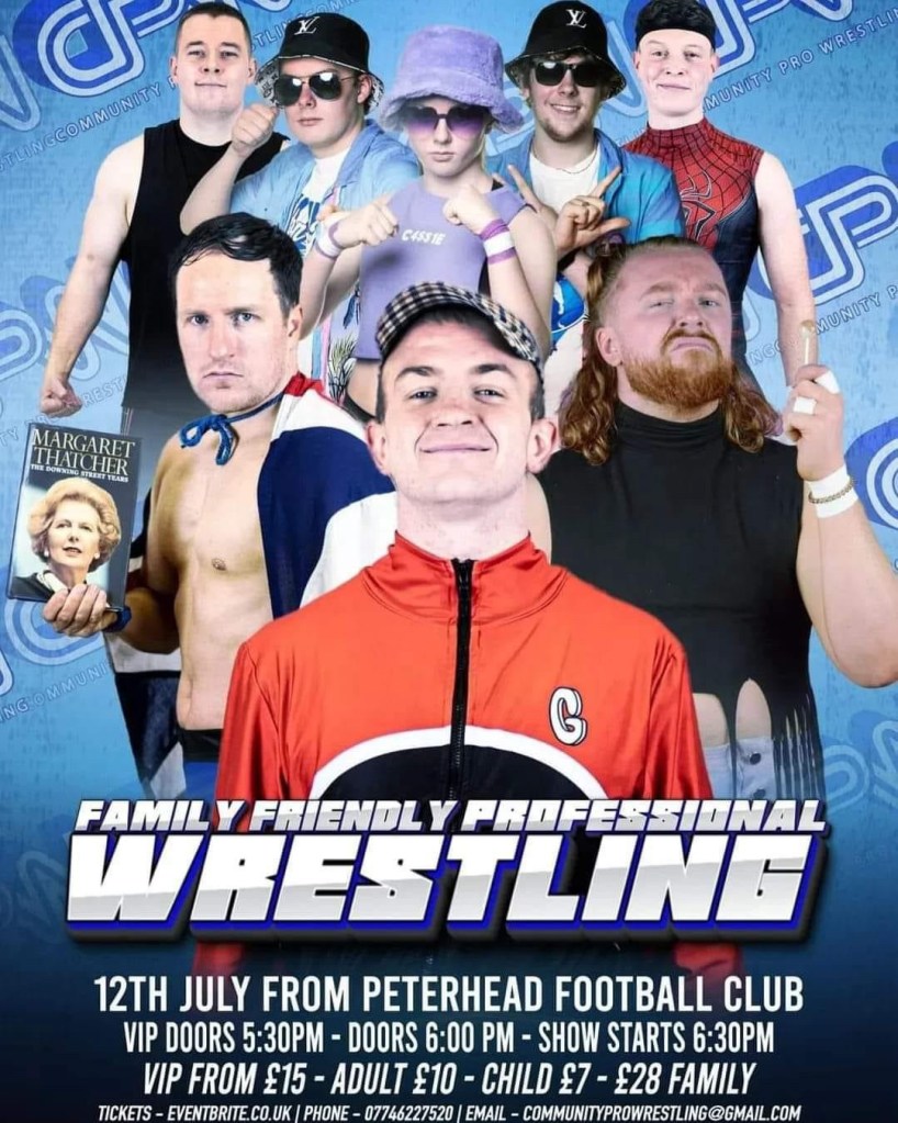I have recorded a road trip podcast, which was supposed to come out next week but the schedule had to be shuffled so here I am panic writing a review to go out in conjunction with the podcast that’s due to come out today. It’s over a week after the fact, two children’s birthday parties, and going to Aberdeen to watch Bluey’s Big Play (no spoilers, in fact we were *this close* to doing a podcast on it…). I’m wandering away from my original point here, aye it’s been over a week so let’s get the cogs turning and talk about Community Pro Wrestling in Peterhead!