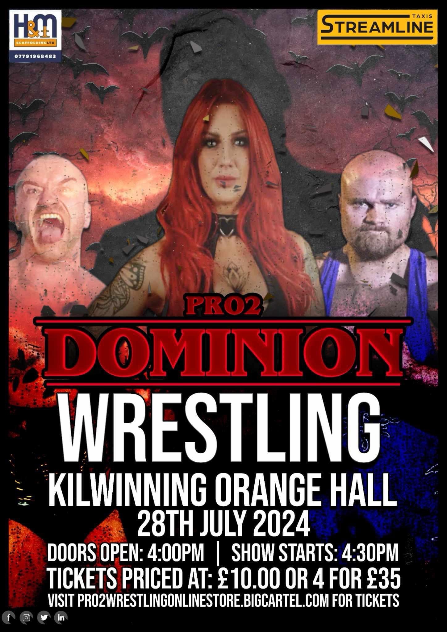 Ayrshire’s only homegrown wrestling promotion continues to break ground as more towns declare themselves as being Pro2. King of the Bing 2 isn’t far on the horizon, but before Pro2 enters the Kingdom of Rankinston, Pro2’s Kingpin Cameron Findlay has decided to not only treat Ayrshire wrestling fans to an extra show but add yet another area to Pro2’s dominion, so to speak. Thus, on the 28th of July, Pro2 Wrestling will return to North Ayrshire for the first time in a year-and-a-half as the Kilwinning Orange Hall presents Dominion. The six-bout line-up is bound to leave North Ayrshire grapple fans gagging for more, and will be deconstructed in this article.